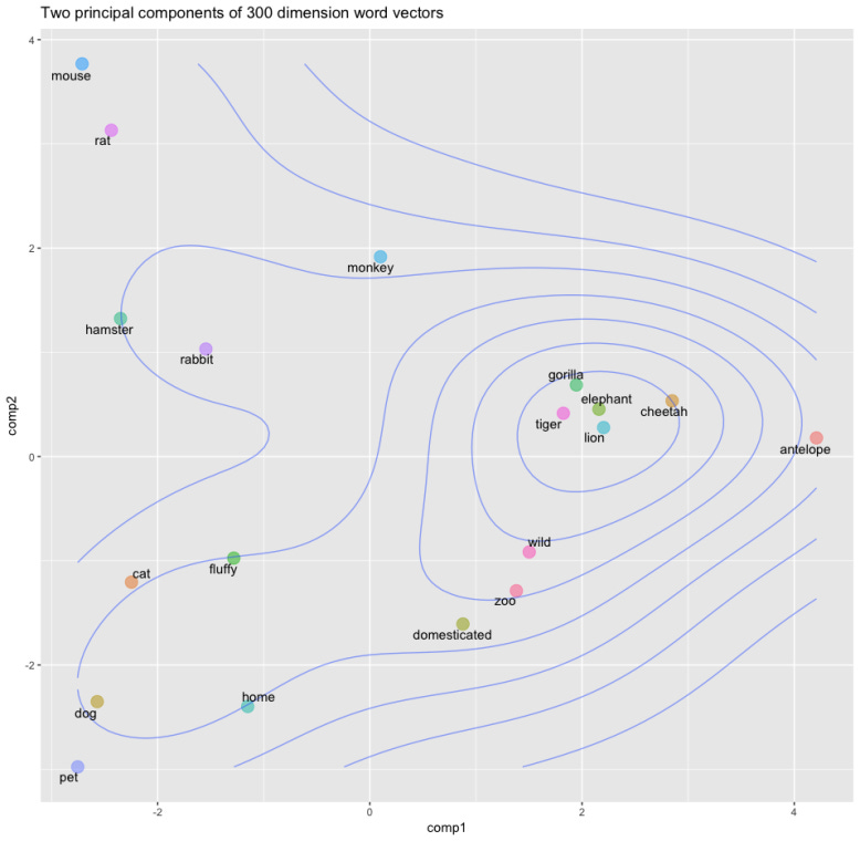 In the example semantic space below, you can see how the vectors for animals like lion, tiger, cheetah, and elephant are very close together. This is intuitive because they are often discussed in similar contexts; for example, these animals are big, wild and, potentially dangerous — indeed, the descriptive word “wild” maps quite closely to this group of animals.