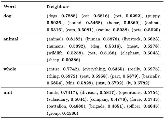In the figure above, for better understanding, we are imagining that each dimension captures a clearly defined meaning as opposed to an abstract idea. For example, if you imagine that the third dimension represents the concept of “fluffiness”, then each word’s weight on that dimension represents how closely it relates to that concept. It makes perfect sense for the rabbit to have the highest fluffiness factor at 0.45. This is quite a large simplification of word vectors as the dimensions do not hold such clearly defined meanings in reality, but it is a useful and intuitive way to wrap your head around the concept of word vector dimensions. We will not delve into the mathematical details of how neural networks learn word embeddings, because that would involve a long detour into linear algebra. But now you do know the underlying idea that drives the mathematics.