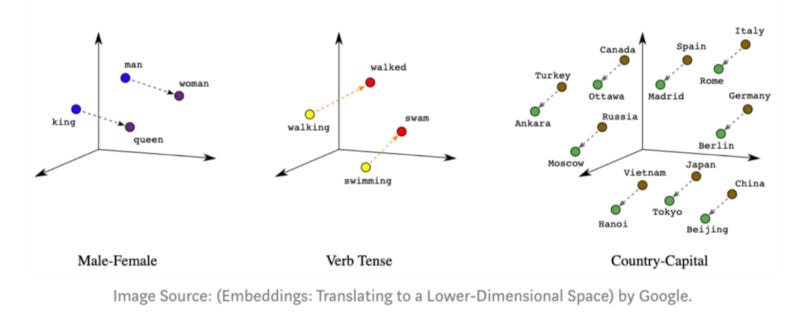 Consider a space where all words in the English language are populated based on their semantic character. This imaginary space is such that words sharing similar descriptions or concepts share similar spacial properties. For instance, the words “cat” and “dog” would be in close vicinity of each other because the idea of a cat is very similar to the idea of a dog. Both are quadrupedal, domestic species that make for cute pets. For words that are not similar in meaning but represent the same concept, the positions of the words relative to each other encapsulate the relationship. In the semantic space, the relative position of “king” to the position of “queen” would be similar to the relative positions between “man” and “woman” or “boy” and “girl”, because the defining concept that separates the words in all three cases is the same — gender.